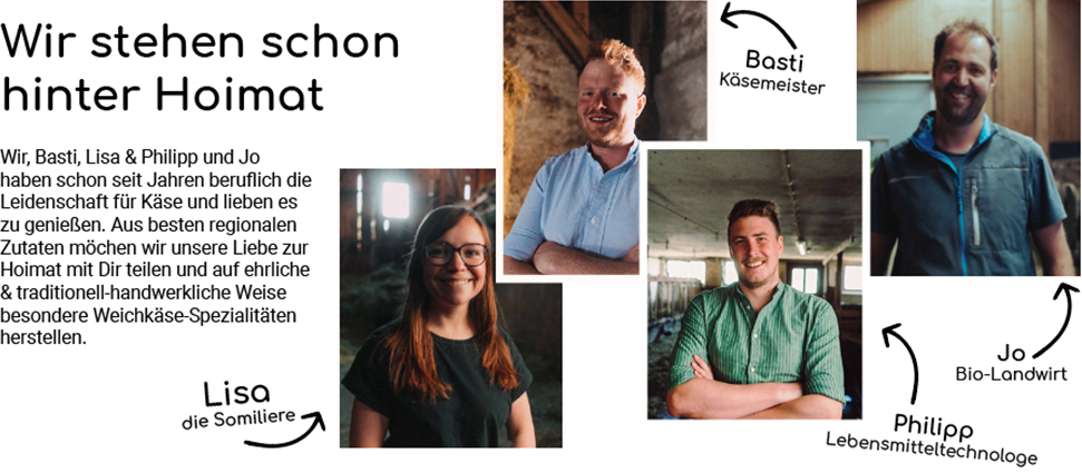 Wir möchten einen Ort schaffen, wo Lebensmittel die Wertschätzung erfahren, die sie verdienen. Aus besten regionalen Zutaten möchten wir unsere Liebe zur Hoimat mit dir teilen. In unseren Käsesorten schmeckt man die Vielfalt der Aromen unserer Heimat. Wir, Basti, Lisa und Philipp, teilen schon seit Jahren beruflich die Leidenschaft für Käse und lieben es zu genießen.