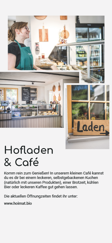 Die Hoimat steht für hochwertige Produkte aus der Region und bietet darüberhinaus mehr als das. Zu den Kerngeschäftsfeldern zählen folgende Punkte.